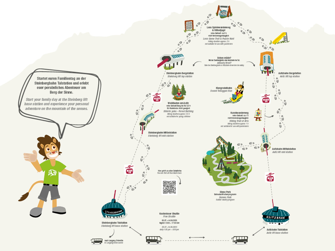Schwebe mit den Kabinen der Steinbergbahn bis zur Bergstation und steige nicht weit davon entfernt in den Spielewanderweg mit Leos Rätseljagd ein. Nach einer aufregenden Wanderung kannst du dir aussuchen, ob du eine Runde mit der Klangrodelbahn drehst, eine Mittagspause in den Bergrestaurants einlegst oder gleich zum Sinne Park an der Asitz Mittelstation gondelst.