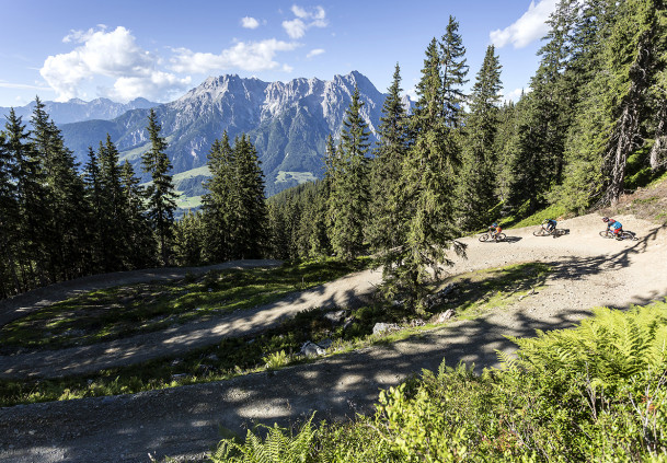 Die 800 m Freeride-Line ist ideal, um den ersten Flow zu spüren. Eine abwechslungsreiche Mischung aus Rollers, Anliegerkurven und Tables. Wer hier ohne Probleme flowig nach unten heizt, bewegt sich auf fortgeschrittenem Anfängerniveau und darf den nächsten Schritt wagen – die Auffahrt mit der Kabinenbahn zu den restlichen Strecken