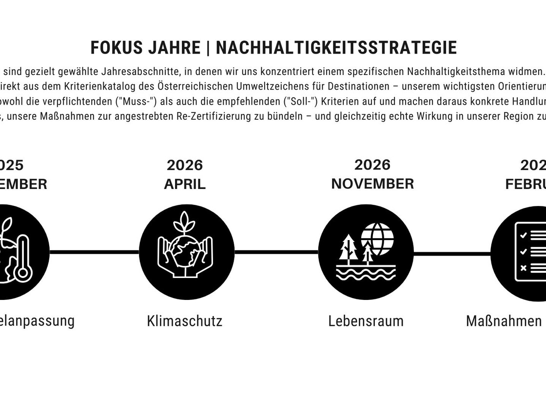 Die Workshops und Veranstaltungen der Fokusjahre bilden die Grundlage für den Aktionsplan 2027–2030 und orientieren sich an den Muss- und Soll-Kriterien des Österreichischen Umweltzeichens für Destinationen. So stellen wir sicher, dass Nachhaltigkeit bei uns konkret, nachvollziehbar und gemeinsam gestaltet wird.