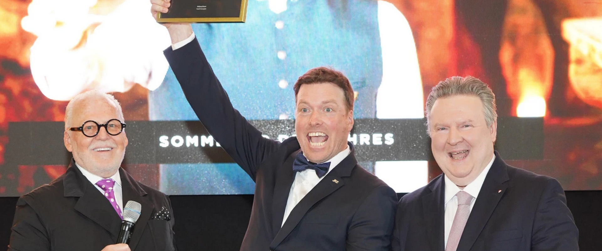 Bild: Großer Jubel für große Leistung: Hans-Jörg Unterrainer (im Bild Mitte) nimmt den Preis als Sommelier des Jahres entgegen. Credit: Falstaff / Andreas Tischler