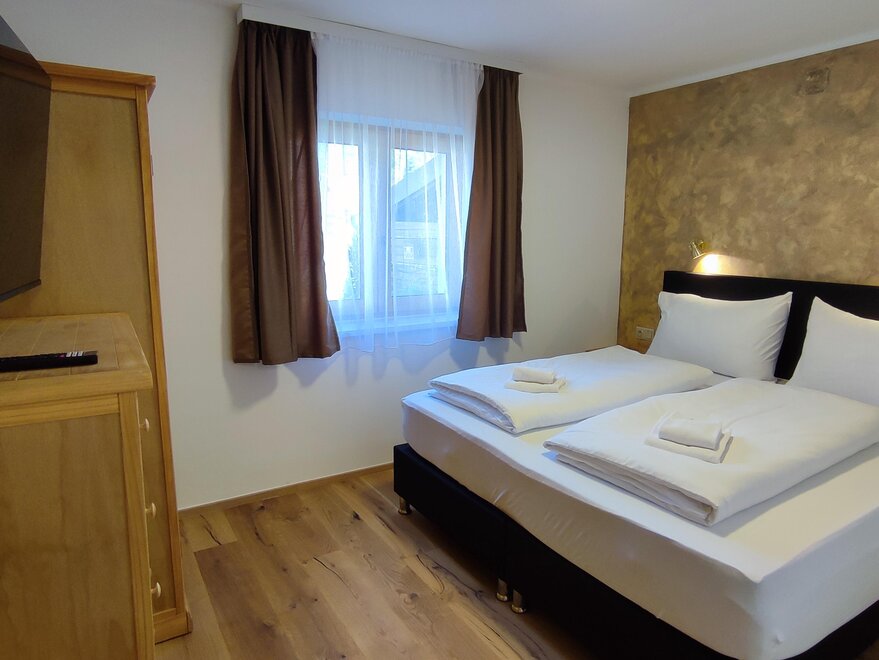 Im Haus ist ein Apartment mit 1 Schlafzimmer ideal für 4 Personen. Die Wohnung liegt auf 2 Ebene: Erdgeschoss: Eingangsbereich mit Garderobe, Wohnküche, 1 Schlafzimmer mit 1 Doppelbett für 2 Personen, 2 Badezimmer mit Dusche und WC. Im Tiefparterre befinden sich den weiteren hellen Räume und ein WC. Es ist bequem auch für 4 Personen.