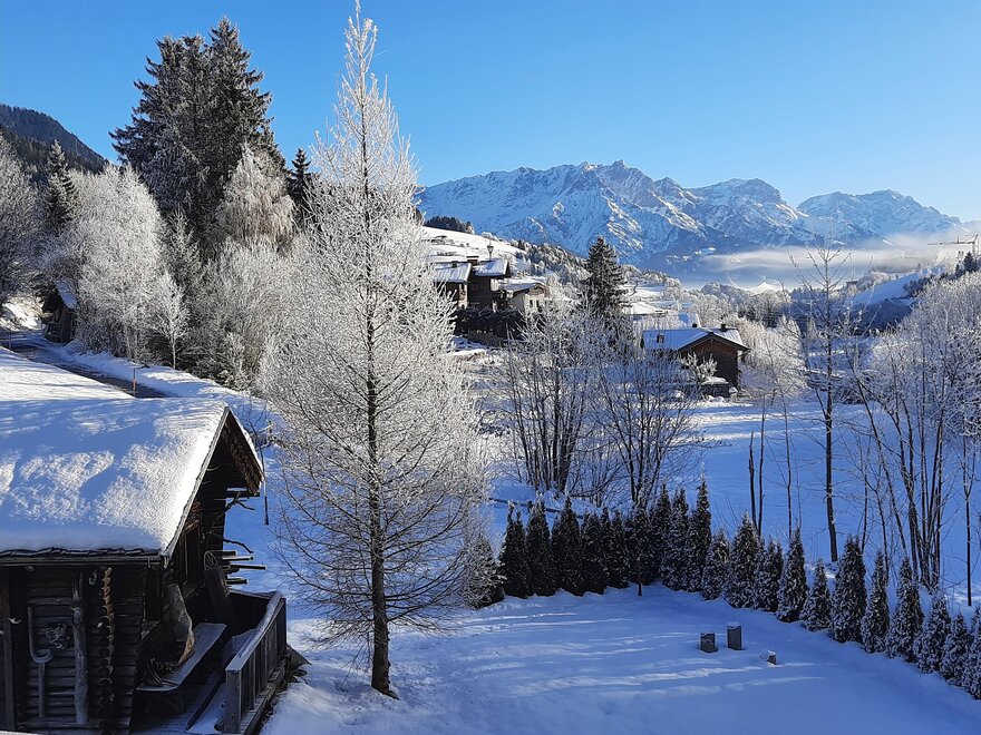 Im Jahr 2021 wurde die Ferienwohnung komplett renoviert, neu ausgestattet und den Bedürfnissen der Zeit angepasst. Die Essküche bietet viel Platz zum gemütlichen Sitzen und ist gut ausgestattet. Zwei moderne Badezimmer (eines davon mit begehbarer Dusche) tragen zur behaglichen Atmosphäre bei. Wie auch der Blick aus den Fenstern auf die umliegende Bergwelt …