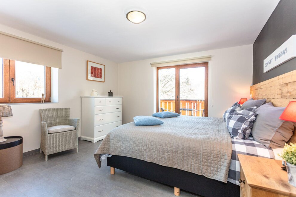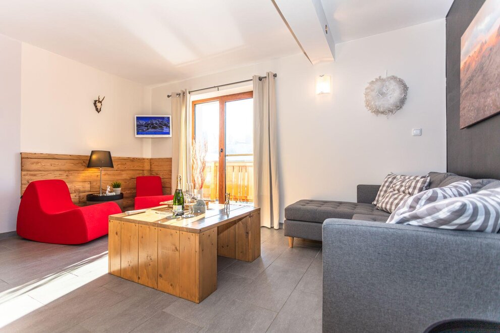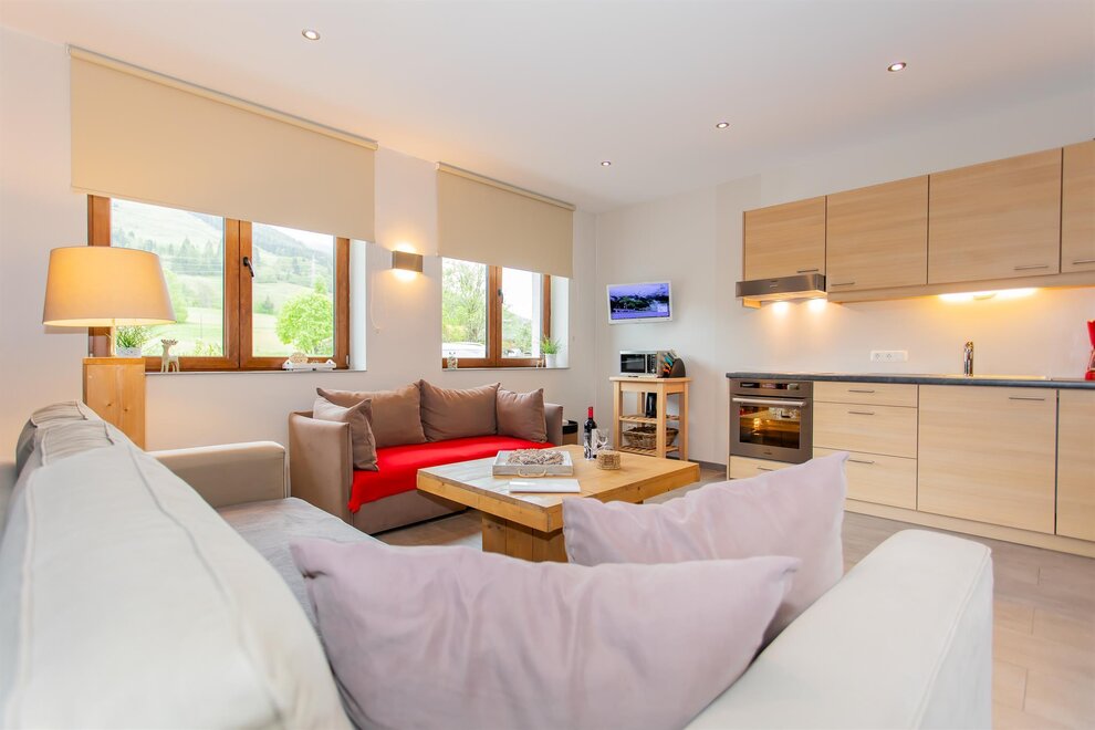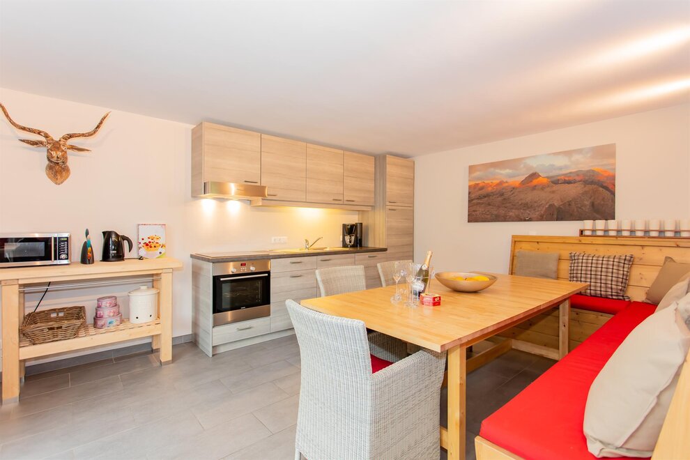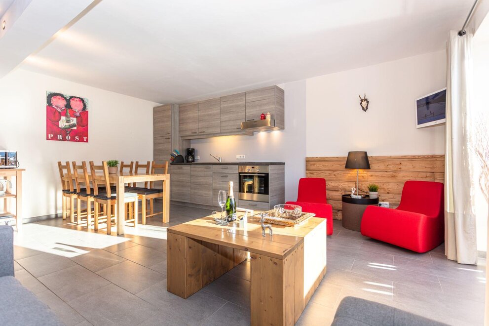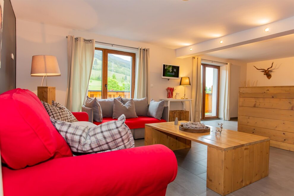 Die Ferienwohnung Asitz hat 58 m² und befindet sich im 1. Obergeschoß. Ost-Westbalkon mit Aussicht auf die Skipiste vom Hinterreit und die Kapelle von Almdorf.