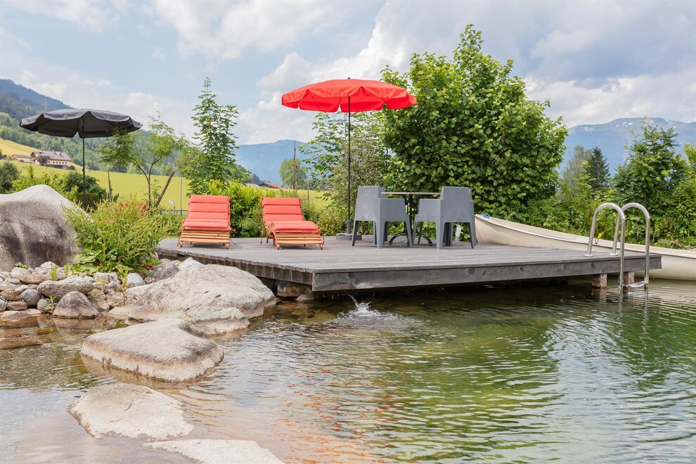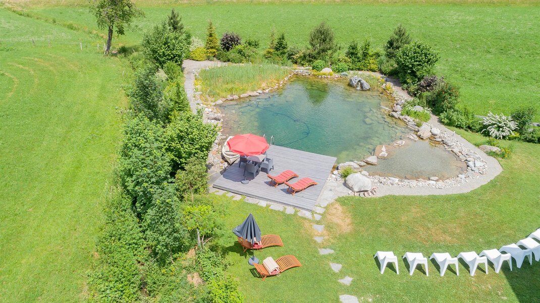 An unserem Bio-Schwimmteich kann man herrlich auf der Liegewiese entspannen. 300m² Schwimmspaß, wobei auch an die Allerkleinsten mit einem Nichtschwimmerbereich gedacht.