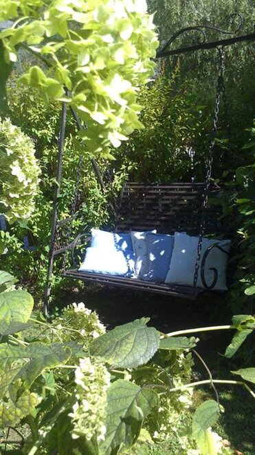 Sehr großzügige und romantische Liegewiese am Bach unter Obstbäumen.