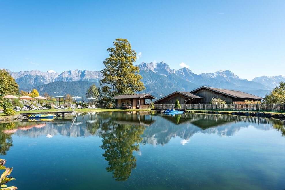 - hauseigener Badesee (700 m² Wasserfläche) mit Sonnenschirme und Liegen, Badeseehütte mit Umkleidekabine, Kühlschrank und Sitzecke