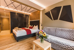 Gebürstetes Fichtenholz, Fleckerlteppich und moderne aber traditionelle Kunst: Genießen Sie auf ca 35 m² groß einen großzügigen Wohn- und Schlafraum mit Sitzecke; Flat-ScreenTV, Telefon, Safe; Badezimmer mit Dusche, Toilette seperat.