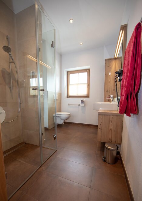 Die neuen Zimmer befinden sich im 1. Stock unseres Bauernhauses. Für Ihre Skiausrüstung stellen wir Ihnen einen Trockenraum im Keller zur Verfügung. Beides ist mit dem Personenaufzug erreichbar.Die Zimmer sind liebevoll eingerichtet und voll ausgestattet. Bettbezüge und Handtücher, Föhn, TV, WLAN ist vorhand. Zimmer für bis zu 3 Personen ( ca. 25 m²) 1 Schlafzimmer mit Doppelbett und flexiblem Zusatzbett*, Bad mit Dusche/WC, Balkon * Flexinno-System – sh. Bilder!