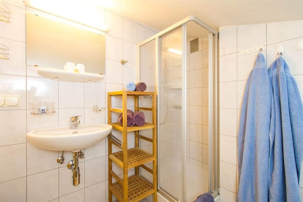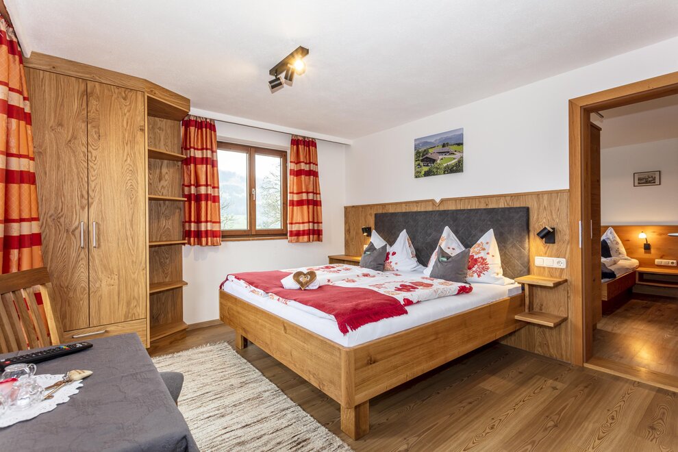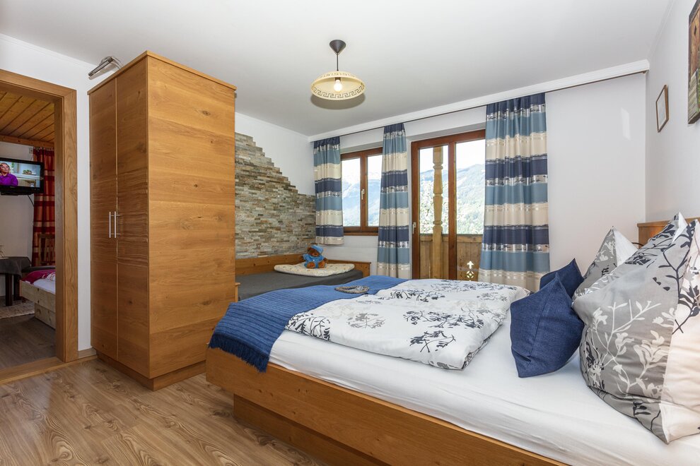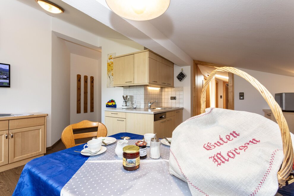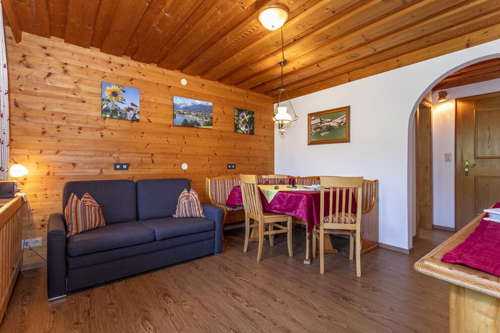 4 - 5 Personen (50 m2): Elternschlafzimmer mit Doppelbett (Zirbenholzzimmer), Kinderzimmer mit 2 Einzelbetten ( Fußende bei allen Betten offen ), Dusche/WC, grosse Wohnküche mit Schlafcouch (5. Person), Eckbank mit grossem Tisch, Küchenblock mit 2 Kochplatten, Mikrowelle mit Backrohrfunktion, Kaffeemaschine, Kühlschrank, Wasserkocher, Geschirrspülmaschine in der Küche, Kabel-TV, Radio, abgeschlossenen Balkon im Dachgeschoß.