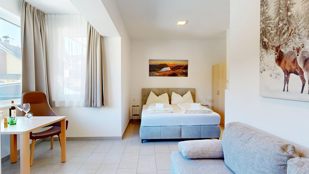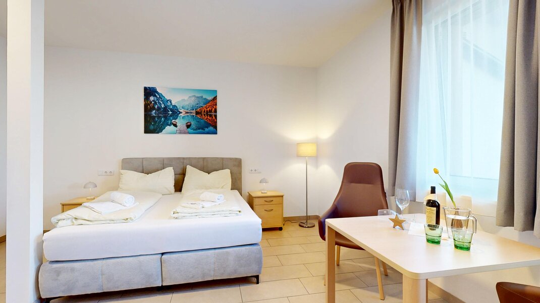 Die Ferienwohnung in unserem Hotel bietet mit 108 m2 großzügig Platz für bis zu 6 Personen, beispielsweise auch 4 Erwachsene und 2 Kinder. Zwei Doppelzimmer bieten Platz für Ruhe und eine Rückzugsmöglichkeit. Zwei Personen finden auf der großen Schlafcouch im Wohnraum Platz.  Zusätzlich stellen wir Ihnen (auf Vorbestellung) gerne ein Gitterbett und einen Hochstuhl zur Verfügung.