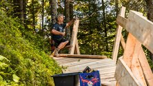 During my research, I visited the trail twice while it was under construction - once in the rain and once in nice weather. In the rain, you can forget about making progress. Without the shale layer, you just sink into the mud or slip - more like a mud fight than trail building! On days like that, the team focuses on tasks like delivering wood for the bridges. In good weather, though, they have the coolest workplace ever! Standing in the middle of a cool forest, with an occasional breeze and wild blueberries - locally known as "Moosbee" - growing along the path. On the nearby Schwarzleo Trail, bikers cruise past, enjoying a trail Reini and Markus built the previous year. What could be better?
