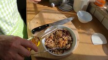- Chop the raisins and walnuts into small pieces and mix it with the jam, cinamon and a splash of rum