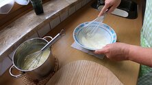 - Save one quarter of the milk for later, put the rest into a saucepan and add sugar and the seeds of the vanilla pod and heat everything