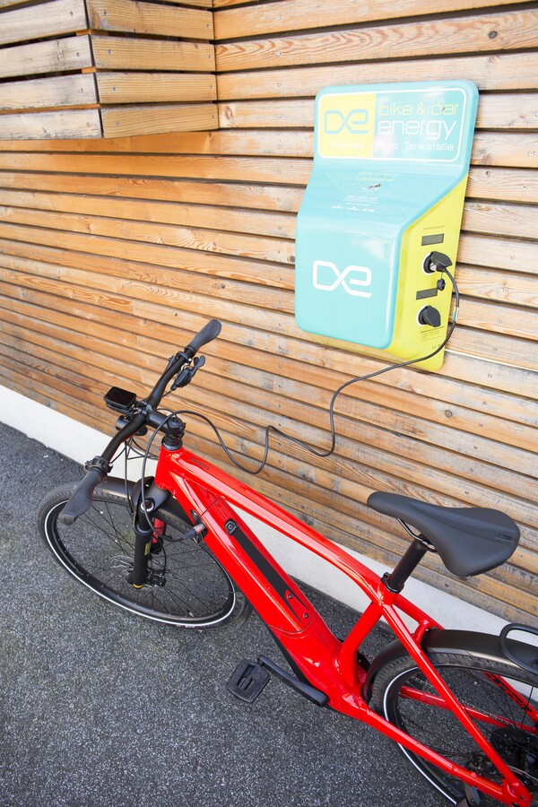bike-energy charging station POINT P2B - connection for 2 e-bikes. You can easily borrow the right charging cable for your e-bike on site, purchase it from the local sporting goods store or order it directly from www.bike-energy.com.