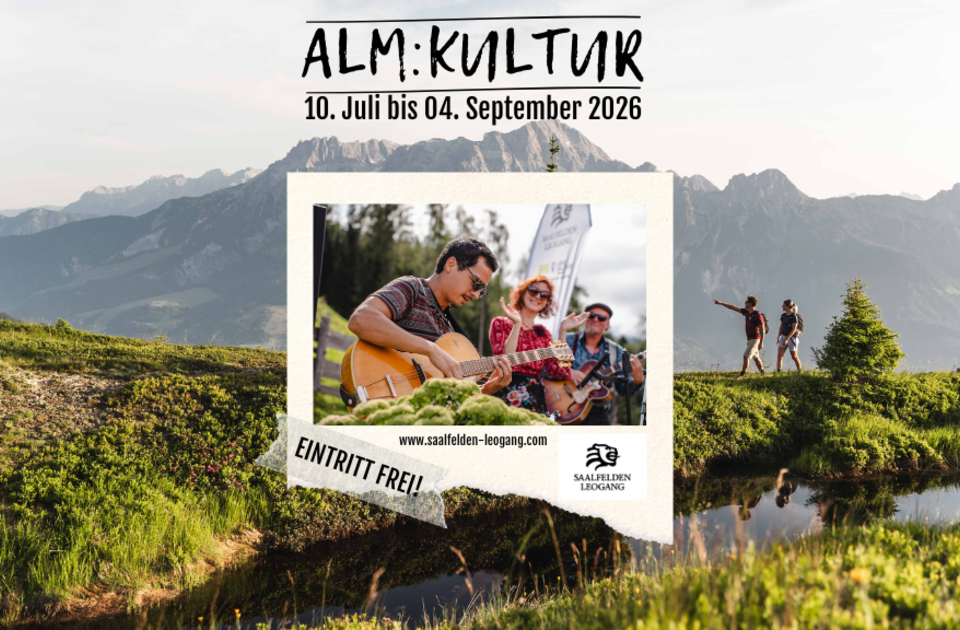 The ALM:KULTUR event series takes place on various alpine pastures in the Saalfelden Leogang region. Due to the natural setting and the terrain, the event locations are unfortunately not fully accessible at all times.