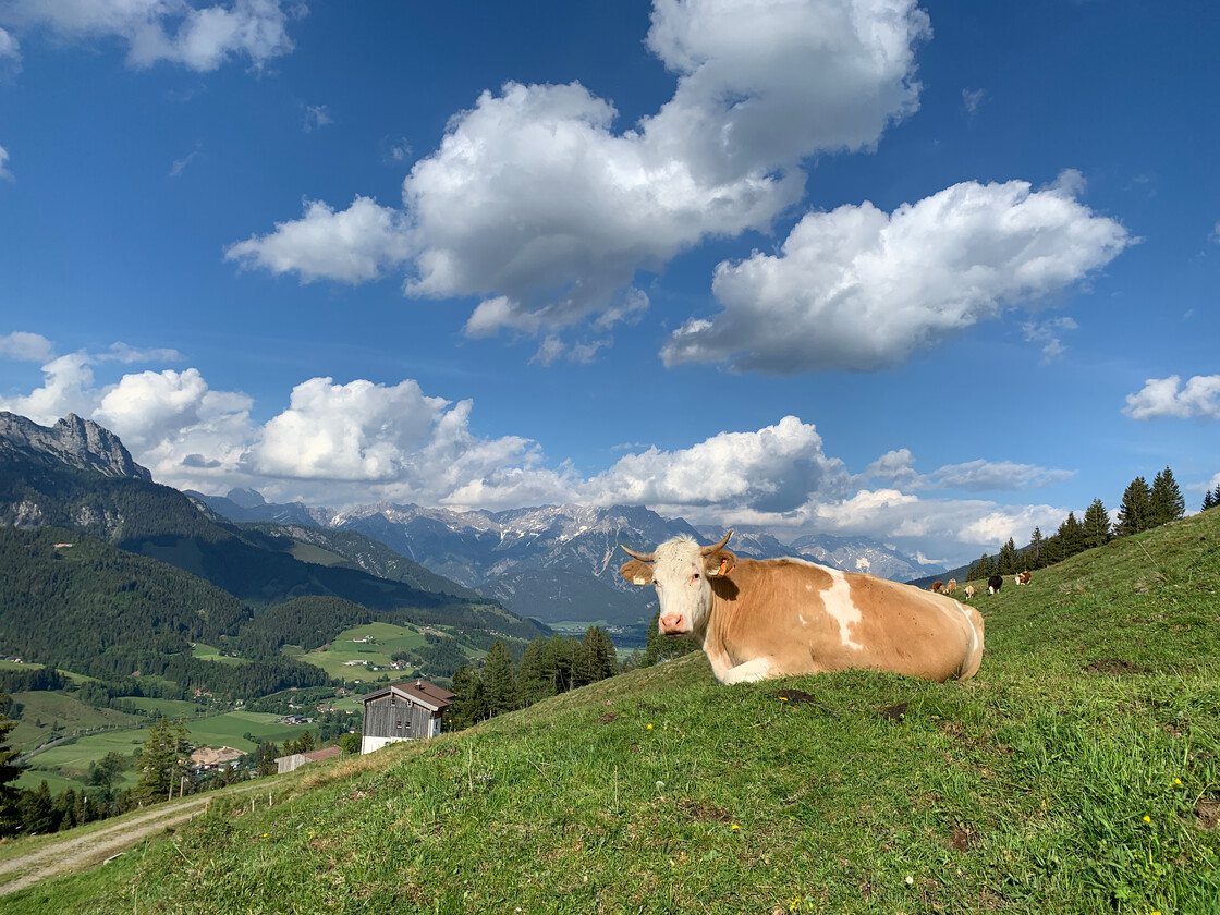 The Neualpe agricultural community currently covers an area of about 96 ha. A total of 58 farmers are involved, 38 of whom still drive their cattle to the Neualpe. A total of about 200 cattle (cows with calf, calves), 320 sheep, and about 10 horses are currently herded on the Neualpe. The Alpine season runs from approx. mid-May through to mid-September. Currently, there is an Alpine hut for the keeper including stables for the animals. A second cattle shelter (Scherm) with water supply was built in the middle of the pasture. The owners also have forest grazing rights with the Bayrische Saalforste, so their cattle can be found in the meadow and in the forest. A safe Alpine environment is achieved by treating the animals in a considerate way. Dogs must be kept on a lead, keep your distance, mother animals will defend their young, especially if dogs are around. The grazing regulation has been in force since 1832 and is still valid and applied in practice. It is important to treat grazing animals with care. Currently, 2 keepers are employed to look after the animals in summer.