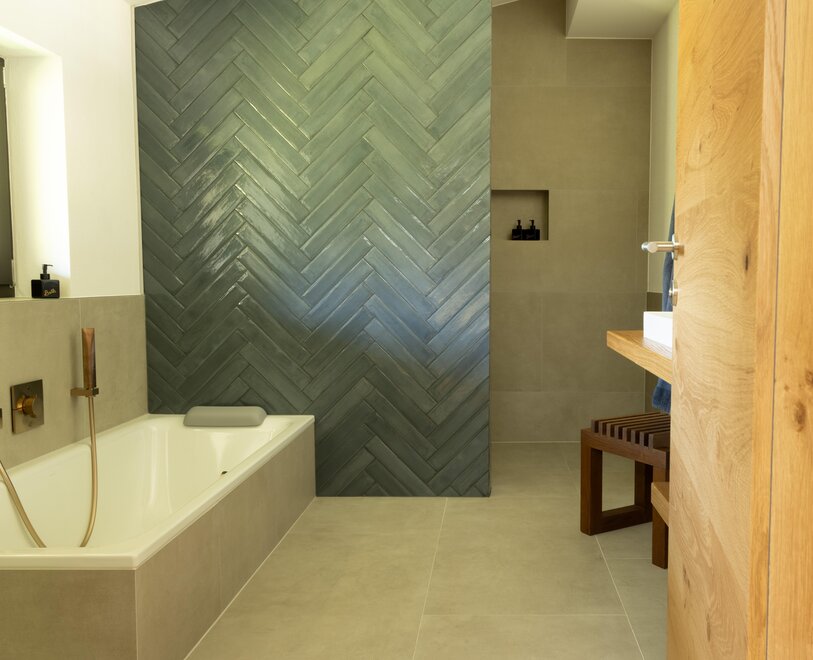 The stylish bathroom features a high-quality bathtub, a spacious rain shower, and a heated bench – perfect for unwinding after a day on the slopes or mountain trails.