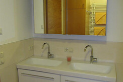 bathtub, shower, double sink, bath, separate toilet, running hot/cold water