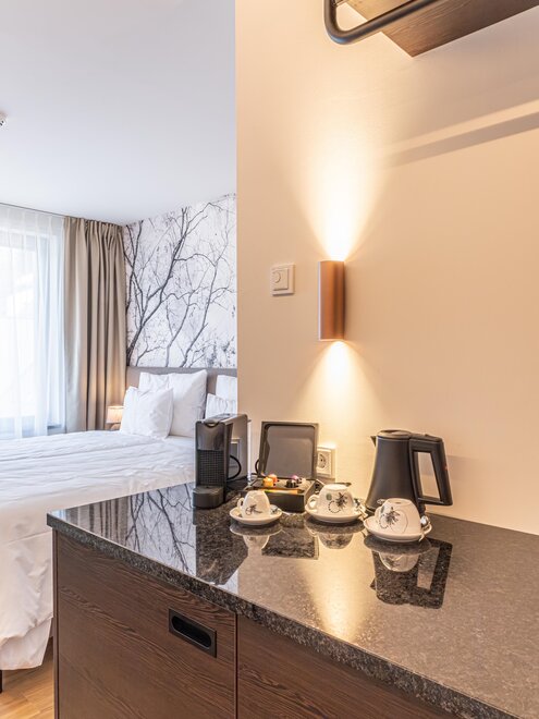 Our Junior Suite, an elegant 28m² suite, offers you not only comfort, but also an inviting lounge area that is perfect for relaxation. The spacious room has a comfortable double bed and a modern bathroom. The suite is equipped with a flat-screen TV, free WiFi and a refrigerator. The additional lounge area offers you the ideal opportunity to sit back and relax, be it after a busy day or simply to enjoy the atmosphere. Experience luxury and comfort in a welcoming environment.