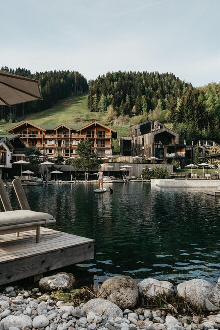 Nestled amidst meadows and private woodlands on the slopes of the Asitz, Naturhotel Forsthofgut offers a five-star retreat featuring Europe’s first waldSPA, a natural bathing lake with panoramic views of the Leogang Mountains, and a 30,000 m² garden. Young guests can explore the miniGUT, an authentic children's farm