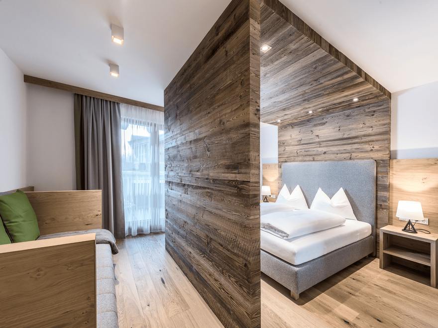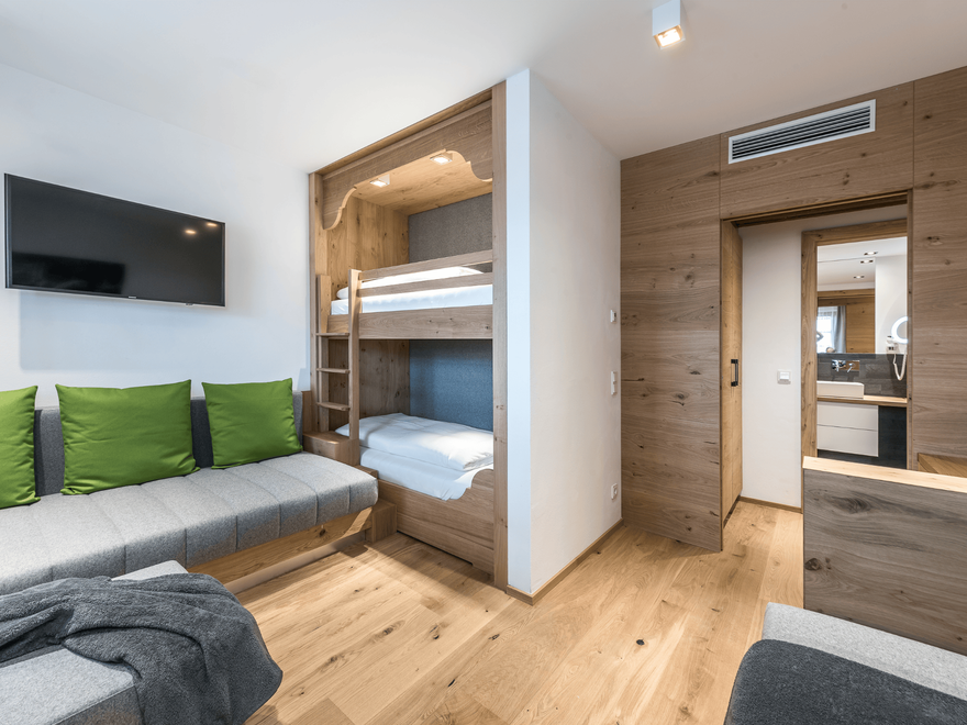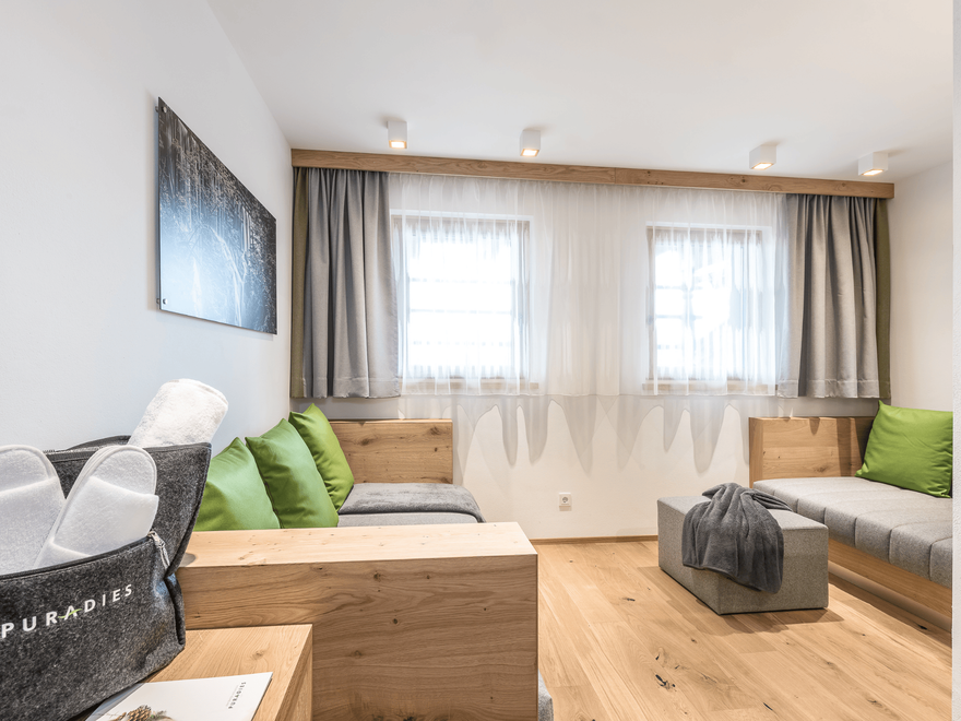 The Puradies Premium Suite offers 55 m² of space for 2 to 6 persons and includes a living/sleeping area with daybed and bunk bed, as well as a separate bedroom. Amenities include TV, Wi-Fi, telephone, safe, minibar, experience shower and/or bathtub, a terrace of over 10 m², coffee/espresso machine, yoga mat, and air conditioning for a comfortable stay.