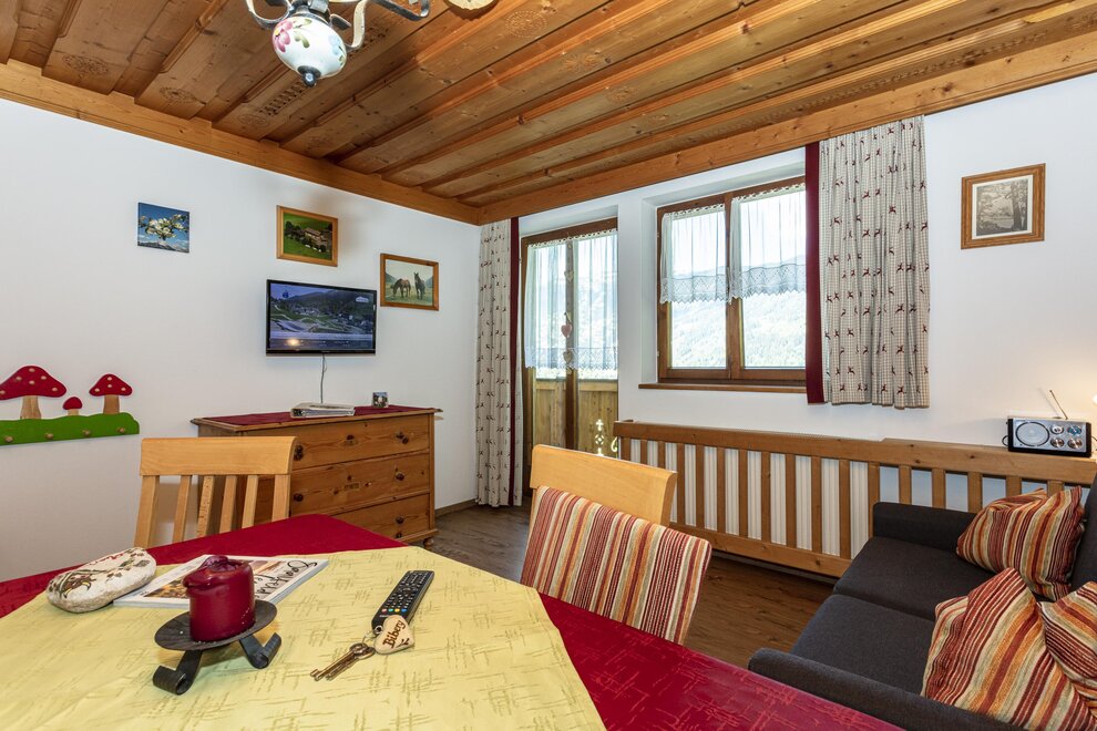 4-5 persons (50 sqm): 1 parents bedroom, 1 children's room with 2 single beds (open bottom part of the beds), shower/WC, large kitchen living with sofa-sleeper (5th person), corner seat with large table, kitchen with 2 hot places, microwave, coffee machine, fridge, water boiler, cable TV, radio, locked balcony on the top floor, towels available! Fantastic view to the mount of Schwalbenwand.