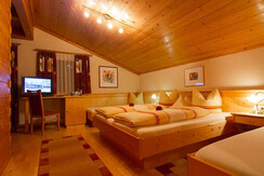 Rustikal eingerichtetes Vierbettzimmer mit Dusche / WC und Fernseher.
