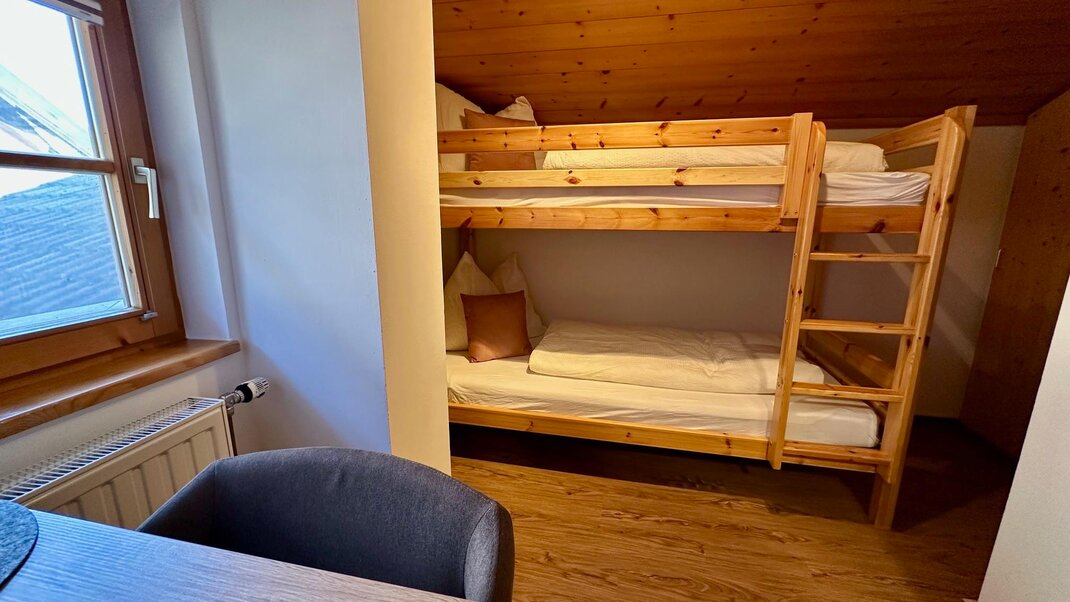 The bedroom consists of a large double bed. A connecting door leads to the second room, where there is a bunk bed for 2 people. In the kitchen/living room there is a sofa bed, which can be used as an additional bed. We are also happy to provide you with a crib on request.